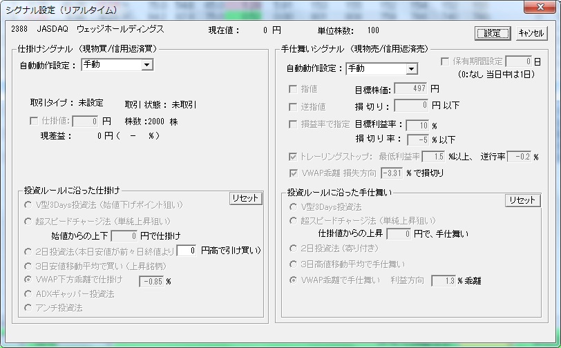 規定の投資ルールと指値は併用できますが、「リセット」ボタンで投資ルールによる手仕舞いをクリアし、目標株価、損切りの手仕舞いとなります。